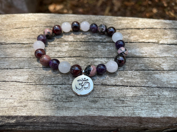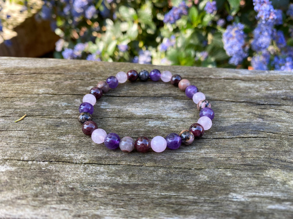 Bracelet élastique de Lithothérapie "Quatre protections" Quartz Rose, Grenat, Rhodonite Améthyste